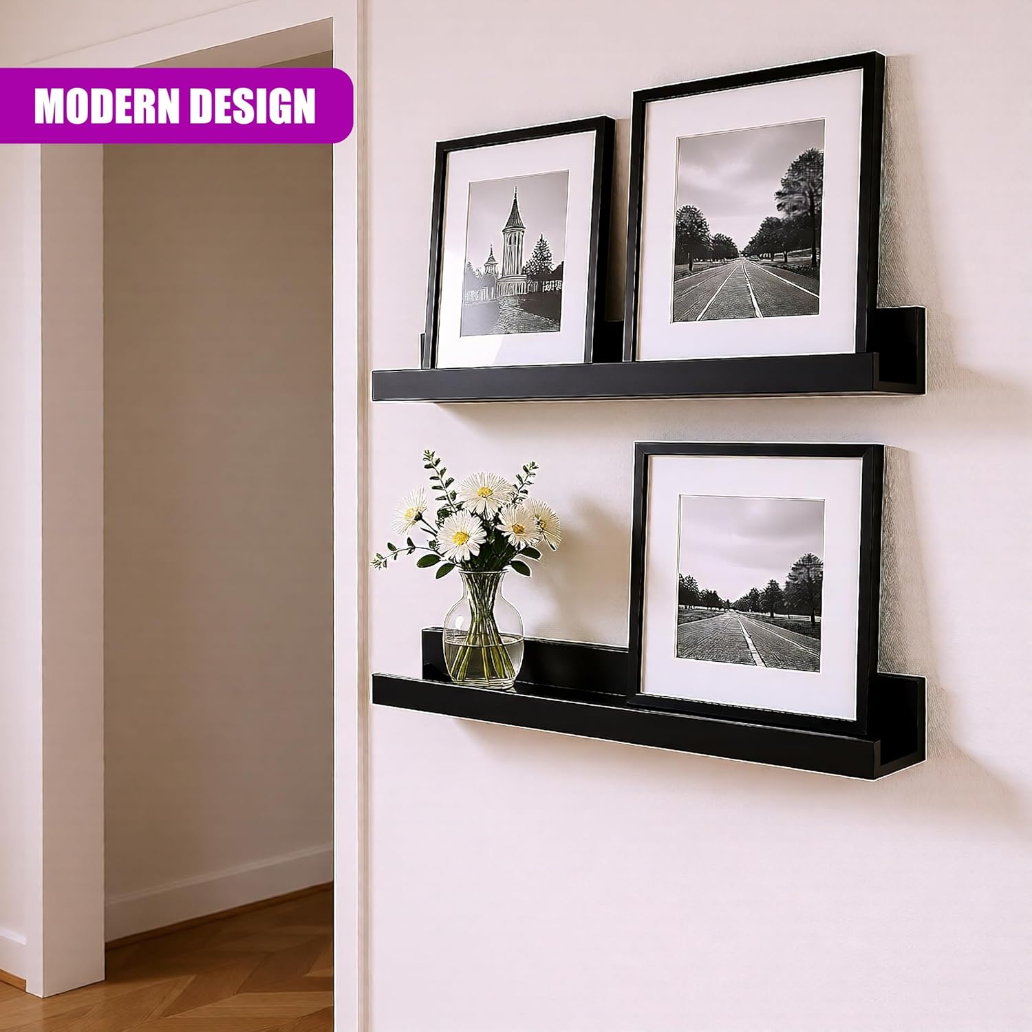 - MULTI-PURPOSE DISPLAY: Use these picture shelf ledge designs for displaying pictures, books, or perfumes. A clean addition to any floating wall shelves for living room collection.